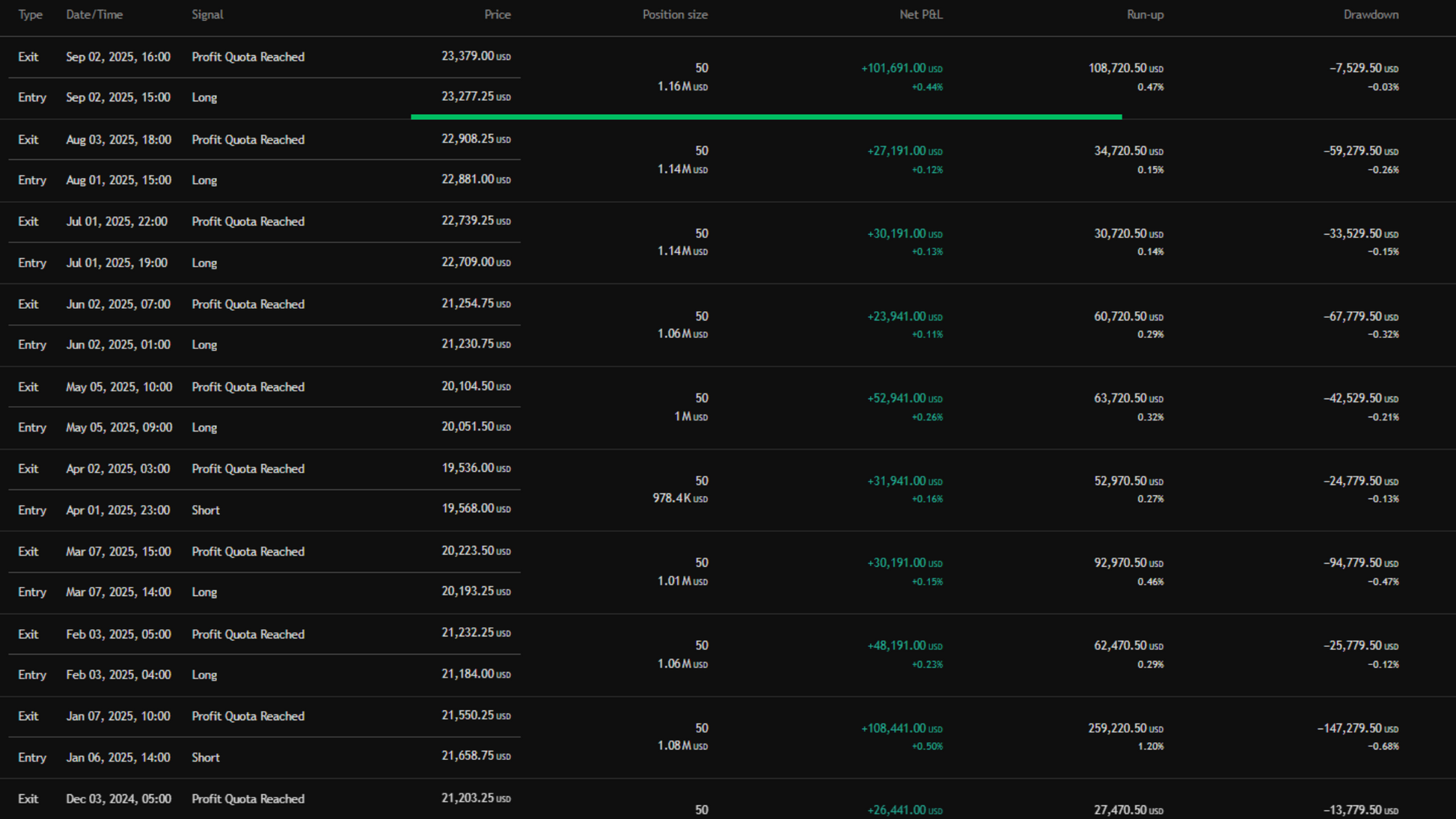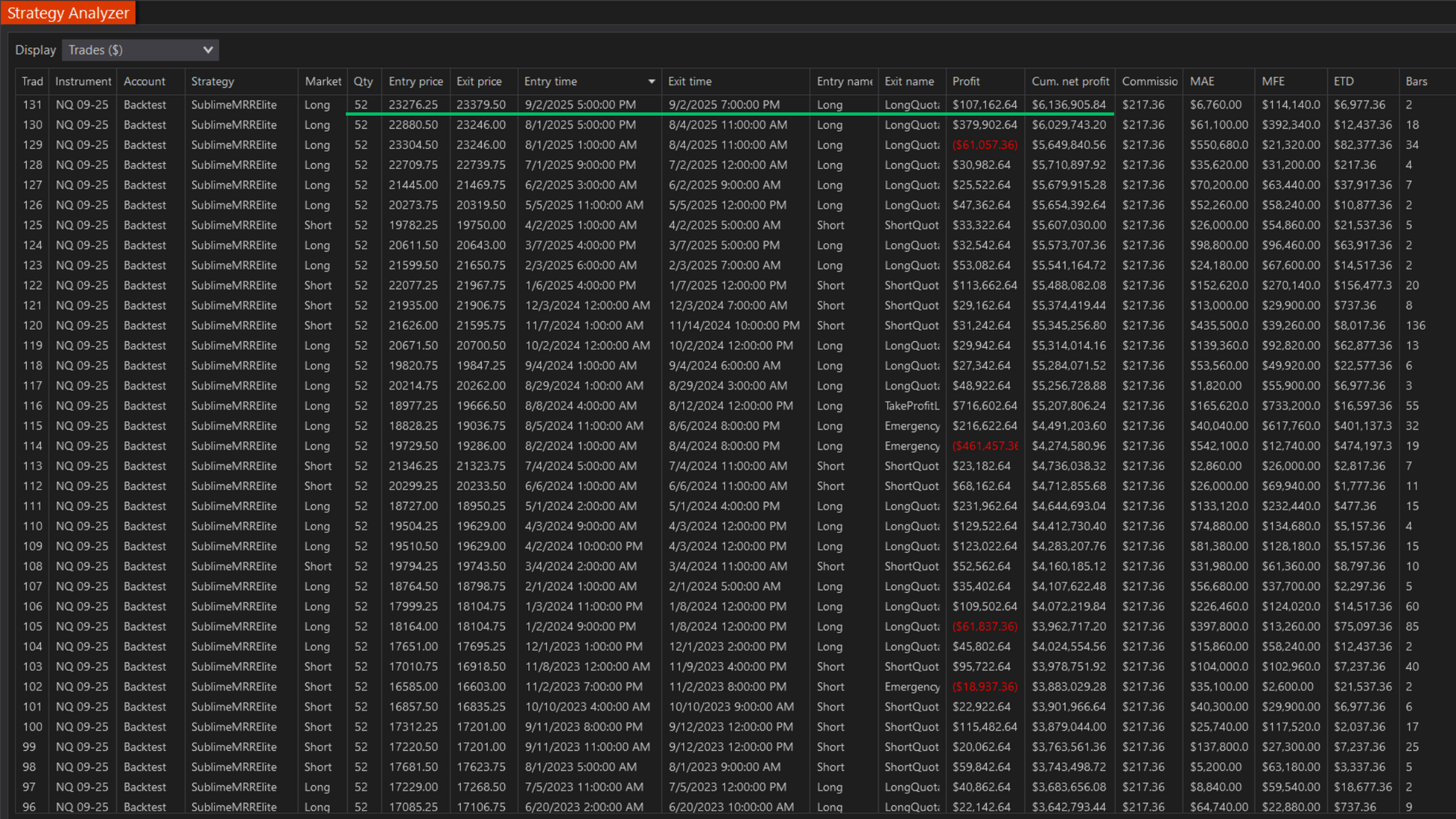 *Although this is less than the initial margin requirement to hold multiple NQ contracts overnight, which is the basis of the product screenshots, users can work around it by reloading the strategy on the chart upon market re-open and syncing it up with the account, which in addition to being safer can lead to slightly more profits. Overnight positions are rare for SublimeMRR but you can of course skip that manual reload by increasing the risk capital to the initial margin to have it be completely hands-off for that 1hr between market close and open and then remove the excess capital after the monthly trade, or you can just offload the management of your VPS setup to us during those rare months!