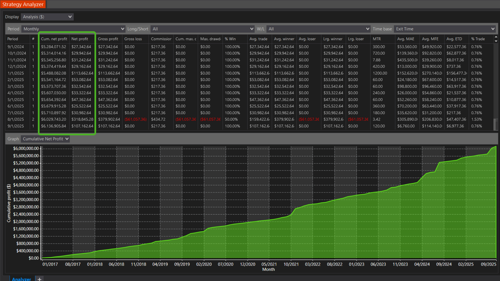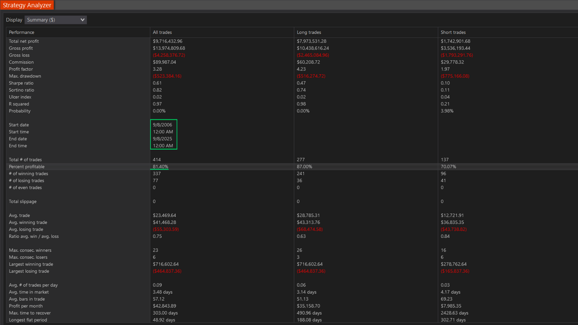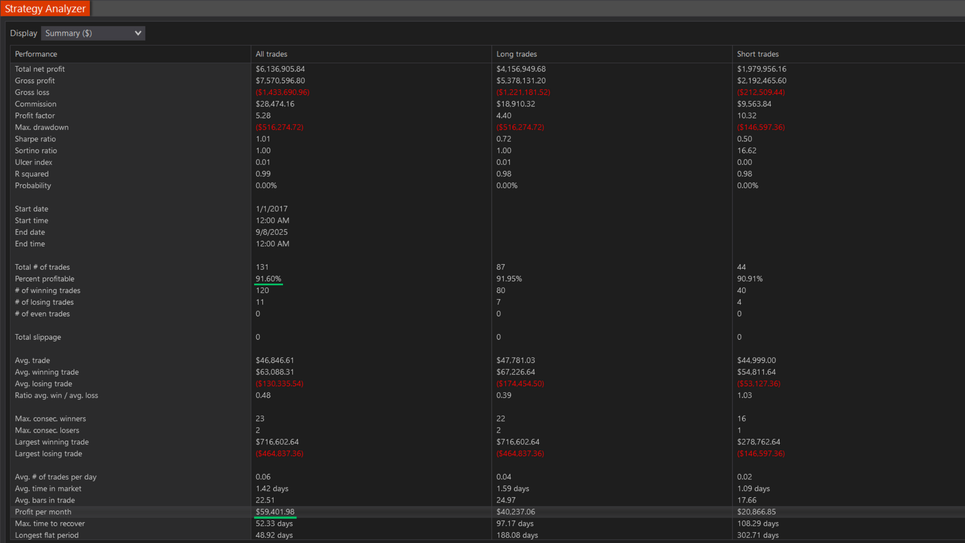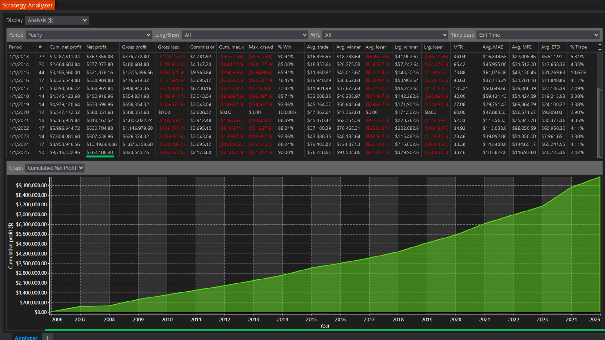 - In terms of deep back tests across the entire available dataset on Ninjatrader the strategy has had only 4 losing months with an average win rate of 80% and not a single losing year across its entire 20-year history in the backtester! (It's important to note that different providers are handling the deep time data in different ways due to which there might be differences with performance results before 2017).